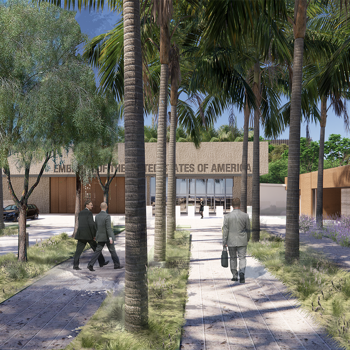 Today, Saudi Arabia is preparing for a prosperous future, with transformation across broad sectors from infrastructure, education, and technology to tourism, sports, and entertainment under the country’s Vision 2030 initiative. Catalyzed by this momentum, the United States and Saudi Arabia are expanding upon eight decades of partnership to drive research and development that will enhance high performance design in the Kingdom and around the world in the decades ahead. At this pivotal moment in Saudi Arabia’s history, the United States is revitalizing its diplomatic buildings across the country. The new embassy in Riyadh represents an opportunity to highlight our shared ideals while providing enhanced facilities for embassy staff and their families and improved services to the thousands of U.S. citizens residing in Saudi Arabia, and the millions of travelers who journey between our nations each year. The values and energy of this moment shape the design of the new embassy, located on a new site in the Diplomatic Quarter in Riyadh next to the dramatic landscape of Wadi Hanifa. With particular attention to supporting the family-oriented nature of the post, the team aligned its approach with goals to provide the most effective facilities for U.S. diplomacy abroad ensuring the United States is safer, stronger, and more prosperous. The new embassy’s design engages with Riyadh’s unique natural setting and cultural heritage to create a public symbol of our countries’ mutual respect, enduring partnership, and optimism for the future.